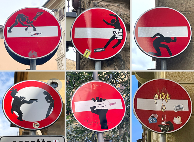 Ganz andere, phantasievolle Botschaften kann man in der Stadt der großen Kunst, in Florenz, an schlichten Verkehrsschildern entdecken. Sie erregen Aufmerksamkeit und regen zu phantasievollen Überlegungen an. Das triviale Verkehrsschild „Einfahrt verboten“ (rund, roter Grund mit weißem Rand und zentralem weißem Querbalken) ordnet üblicherweise in den engen Straßen der florentinischen Altstadt die möglichen Durchfahrtrichtungen. Aber es regt auch die Phantasie an: